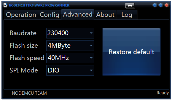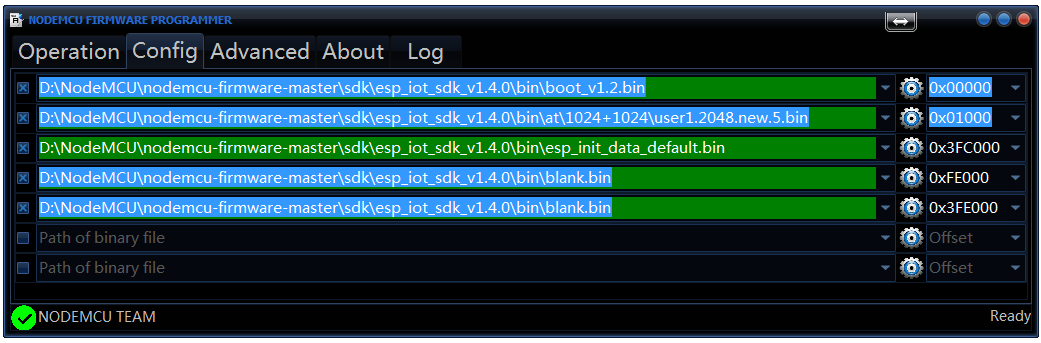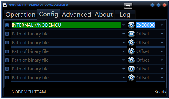 在Config頁面,預設會自動使用INTERNAL://NODEMCU,位址設定為0x00000: