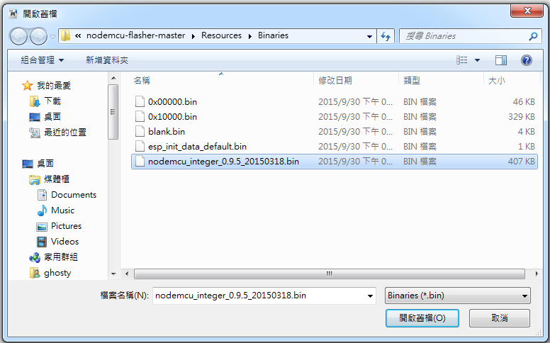 如果想手動變更燒錄檔,可以按下齒輪按鈕,選擇所需要的檔案,並設定燒錄的位址。預設的檔案是在Resource\Binary\nodemcu_integer_0.9.5_20150318.bin: