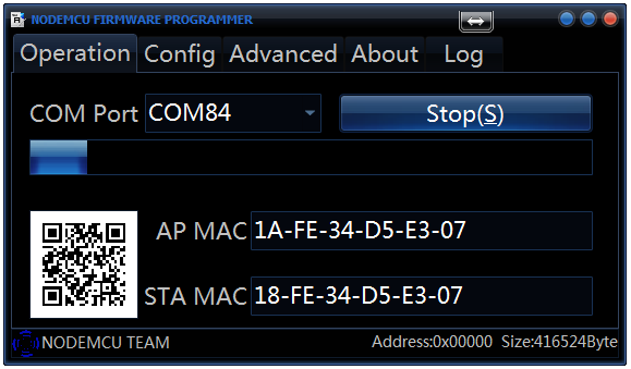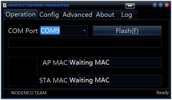 回到Operation頁面,按下 FLASH(F) 開始燒錄,開始燒錄後會自動取得MAC位址,NodeMCU上ESP8266-12模組GPIO-4的LED開始閃動,此時可以切換到Log頁面看燒錄狀況: