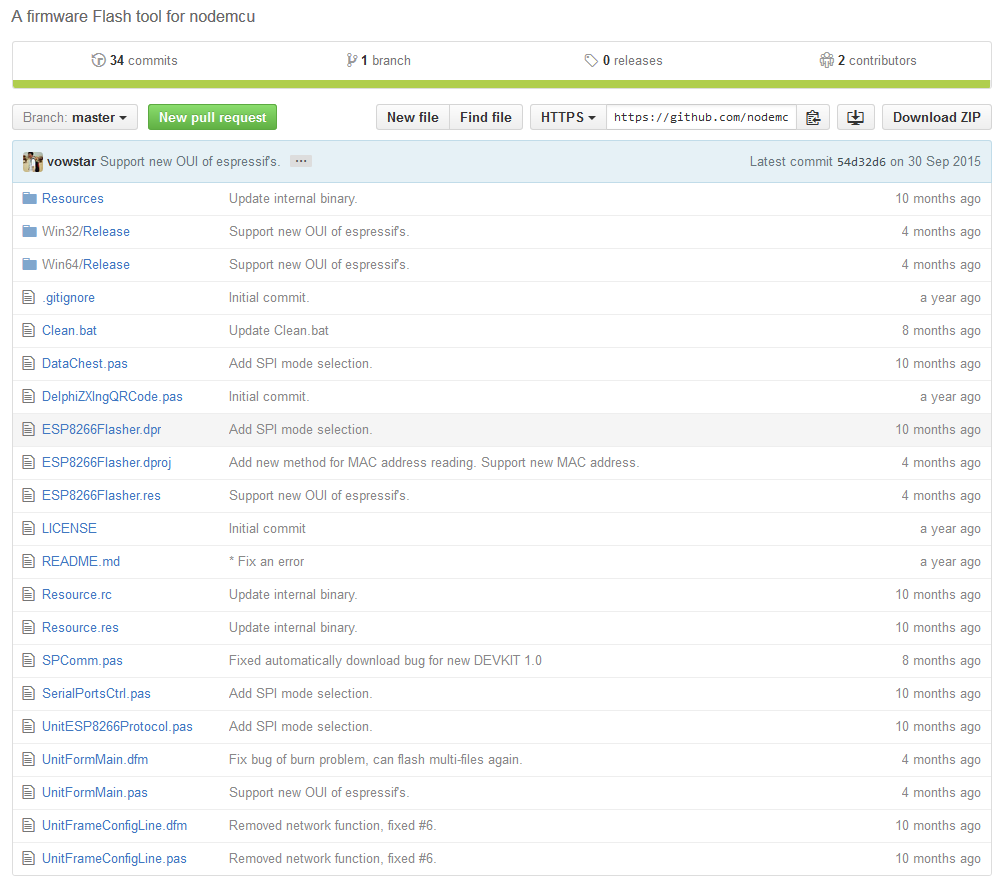 首先到https://github.com/nodemcu/nodemcu-firmware,按下 Download ZIP ,下載最新版本韌體檔,稍後燒錄要用到的二進位檔,放在 \sdk\esp_iot_sdk_v1.4.0\bin 目錄: