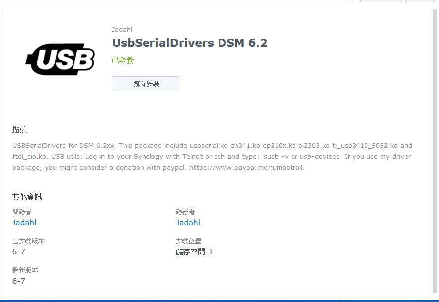 最近想在 NAS 透過 USB Serial 連到外部裝置, 找到這個網站: http://www.jadahl.com, 我的 NAS 是DS918+, 點選右上角 DSM6.2 drivers 進入驅動程式頁面 (http://www.jadahl.com/drivers_6.2/), 找到 DS918+ 的驅動程式, 下載後檔名為 UsbSerialDrivers_apollolake-6.2_6-7.spk, 進入 NAS 套件中心, 使用手動安裝後, 顯示安裝成功: